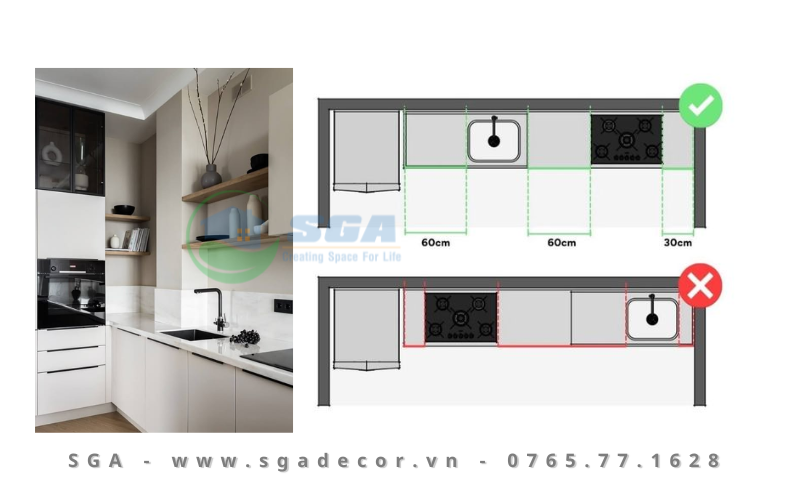 - Đảm bảo có khoảng cách tối thiểu giữa bếp nấu và bồn rửa, lý tưởng là từ 60-90 cm.